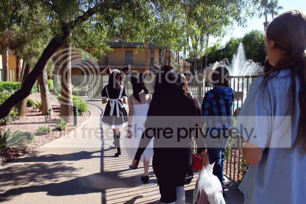At the Stripppp. My hair looks so frizzy and insane in the second one. I guess that's what walking around out all night will do to curly hair. =w= That was the JSK I got the drunk dude asking for picture in. It's a Bodyline dress that I bought for wardrobe filler, but it's really quite comfy.